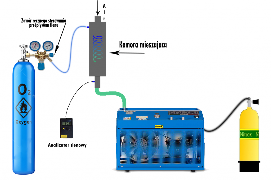 - The continuous mix method is used to prepare nitrox mixtures, among other methods. This method allows for the production of nitrox mixtures up to 40% O2 using a standard compressor. This method involves adding pure oxygen to the air drawn in by the compressor. The added oxygen and air are mixed before entering the compressor in a mixing chamber, also known as a nitrox stick, to achieve a homogeneous mixture. At the exit of the mixing chamber, the mixed gas is continuously analyzed by an oxygen analyzer connected to the system. The analyzer’s readings are the basis for manual regulation of the oxygen flow into the mixing chamber. Manual regulation is performed using a knob on the oxygen regulator connected to the oxygen cylinder.