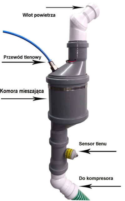 - This flow is manually regulated while continuously monitoring the oxygen analyzer’s readings. It’s also important that the oxygen analyzer be equipped with an oxygen sensor whose response time to the presence of oxygen is no longer than 5 seconds. Once established, the flow can, of course, change slightly as the cylinder is filled with gas, so a blender must be present at all times during this filling method. Another important issue is the construction of the mixing chamber itself. It should be small enough to allow the system to react quickly to flow changes and should not have too many constricting or blocking elements, which could increase suction resistance during this mixing phase. There are several methods for achieving a homogeneous mixture, including mixing by swirling the oxygen and air streams, mixing by separating the oxygen stream within the stream drawn in by an air compressor, or mixing using special baffles or plastic balls with holes. One of these methods is used in my mixer. The mixing chamber is constructed of interconnected PVC pipes. This makes it lightweight and easy to hang on the wall, and after disassembly, it can be easily cleaned inside. It also has a replaceable tip for connecting to the compressor’s suction hose.